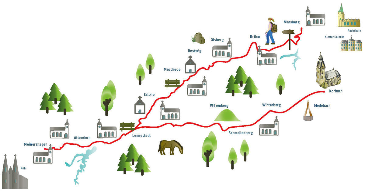 Der Pilgerweg beginnt in Korbach an der Kilianskirche, der Pfarrkirche der historischen Altstadt. In der Kirche ist auch die offizielle Stempelstelle eingerichtet. Von Korbach aus verläuft die Heidenstraße über die Höhenzüge des Sauerlands bis nach Meinerzhagen – von dort geht es weiter in die Domstadt Köln, einem bedeutenden Etappenziel auf dem Weg nach Santiago de Compostela.